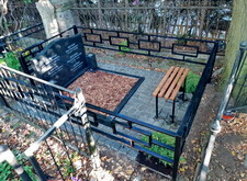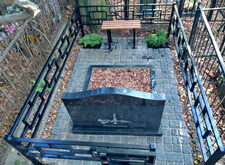 Приносим уже готовую и покрашенную оградку, устанавливаем, свариваем по месту. Параллельно с этим, по дополнительному заказу клиента, устанавливаем по обе стороны от памятника траурные урны, а напротив него – лавочку и две небольшие клумбы с можжевельниками.