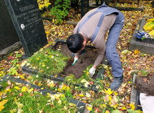 Первым делом мы подготовили могилу к проведению работ: аккуратно извлекли пласты земли с газоном, тем самым освободив цветник.