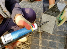 В углу участка делаем лавочку. Брусчатку под её ножками зачищаем, всё выставляем по уровню, для дополнительной надёжности конструкция удерживается е только на клею, но и на штырях. Параллельно делаем верх одного из памятников.