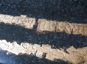 Саму гравировку мы выполнили при помощи пескоструйного аппарата и сразу же принялись за покрытие текста сусальным золотом. Начали с орнамента, так как работать с элементами декора проще, чем с печатным текстом.